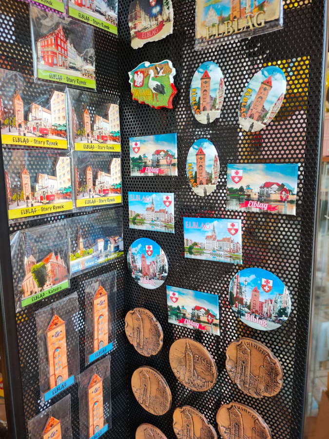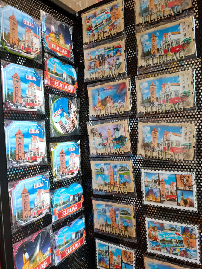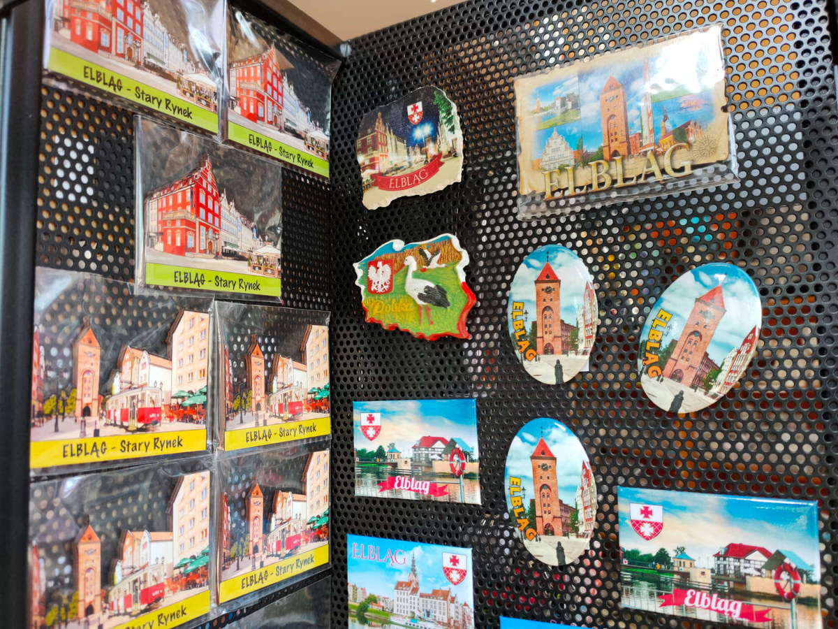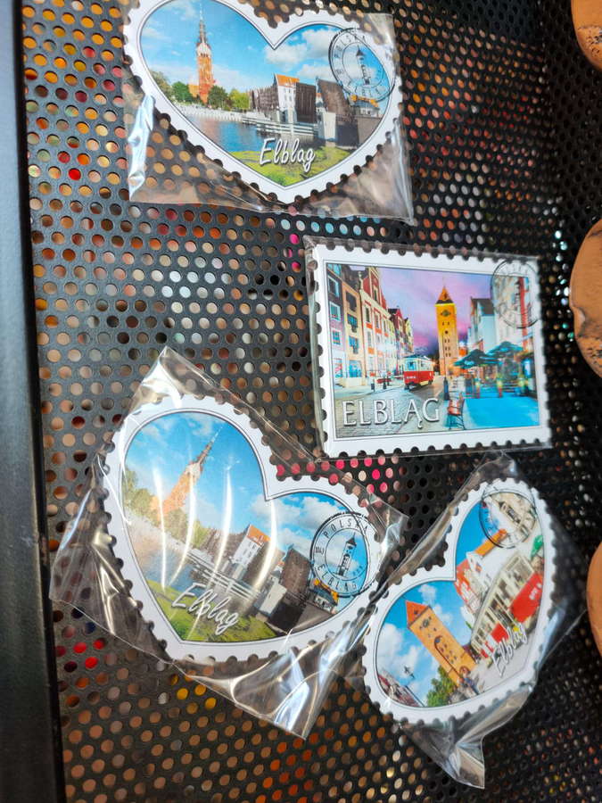 Bogata kolekcja magnesów na lodówkę z Elblągiem, jako motywem przewodnim.